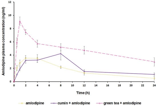 Plasma drug concentration-time curve in rats treated with amlodipine, cumin + amlodipine, and green tea + amlodipine.