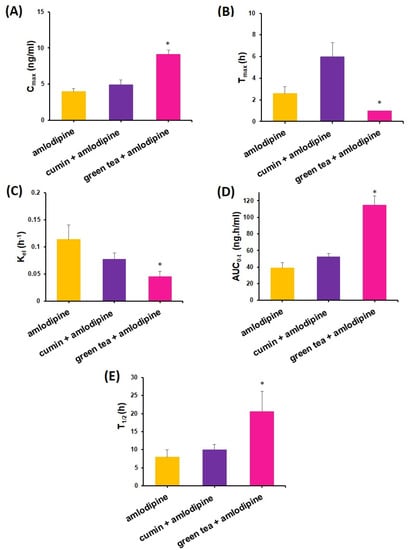 Pharmacokinetics parameters (A) Cmax, (B) Tmax, (C) Kel, (D) AUC0-t, and (E) T1/2 of amlodipine in hypertensive rats treated with amlodipine, cumin + amlodipine, and green tea + amlodipine (mean ± SEM, * p < 0.05, n = 5).