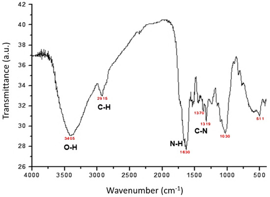 The strong and broad O-H band is the result of this polymeric constituent. The C-H stretching band is derived from the primary and secondary carbons (CH3 and CH2). The prominent band at 1630 cm−1 can be attributed to the twisting vibration of the primary N-H bonds present in the amino acid structures. The infrared absorption bands observed at 1370 and 1320 cm−1 correlate with the stretching of the C-N bonds of aromatic amines found in the material. The absorption band located at 1030 cm−1 can be attributed to the symmetric stretching vibrations of the C-O bonds in the alcoholic groups. In the infrared spectrum, we cannot confirm the presence of carboxyl groups because the C=O stretching band generally observed in the wavelength range between 1760 and 1690 cm−1 is not present.