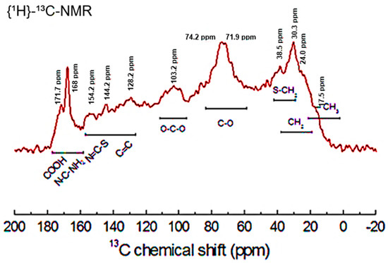 Figure 2 shows the 13C-NMR spectrum of the pulverized material. The highest resonance, observed at 74.2 ppm, corresponds to the C-OH groups of flavonoid glycosides, which are the main non-structural constituents of persimmon leaves. This large resonance signal can also be assigned to the carbons of the C-O bonds present in the flavonoid and coumarin rings. The signal observed at 171.7 ppm can be attributed to COOH groups of fatty acids and terpenoids present in considerable amounts in the leaves [50]. A high resonance peak, observed at 168.0 ppm, may be associated with the carbons of the guanidine and carbamoyl groups present in the amino acids arginine and citrulline, respectively [51]. The observed resonances between 154.2 and 144.2 ppm may be related to the N=C-S groups found in thiamin [44].