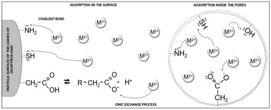 Schematic representation of possible interactions between the material surface functional groups and divalent metal cations. The arrow indicates the complexation of the metallic species.