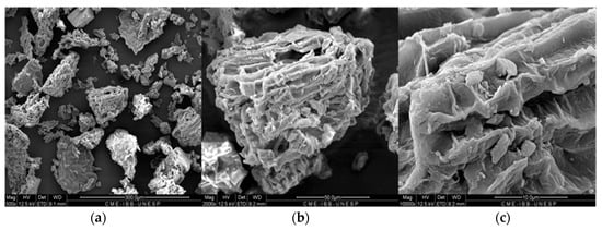 The ground material was also analyzed by SEM to determine particle size homogeneity and particle morphology. According to Figure 4, the particle size is not homogeneous, and some particles have very irregular shapes. Furthermore, these particles exhibit a notably coarse microscopic texture characterized by irregular channels. This feature contributes to an increased surface area of the material and offers numerous adsorption sites for metal species.