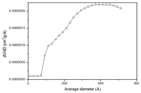 The pore size distribution curve (Figure 5), displays a wide and non-uniform distribution of pores, featuring a mesoporous structure in the range of 350 Å to 400 Å, with a specific surface area of approximately 0.44 ± 0.015 m2 g⁻1.