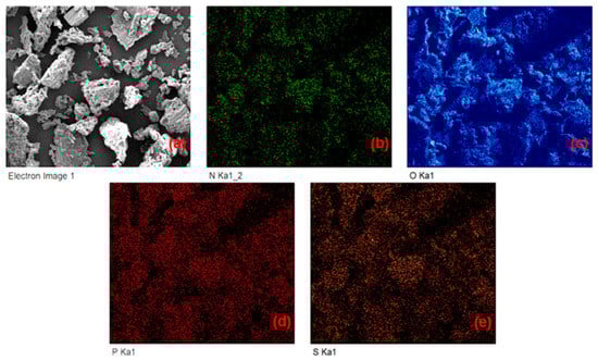 EDX analysis was performed to map the distribution of the elements of interest onto the surface of the particles, and the collected elemental maps enabled the construction of Figure 6. The EDX maps indicate that N, O, S, and P are homogeneously distributed on the surface of the particles, and these elements are the main constituents of the groups of interest for the complexation of metal cations.