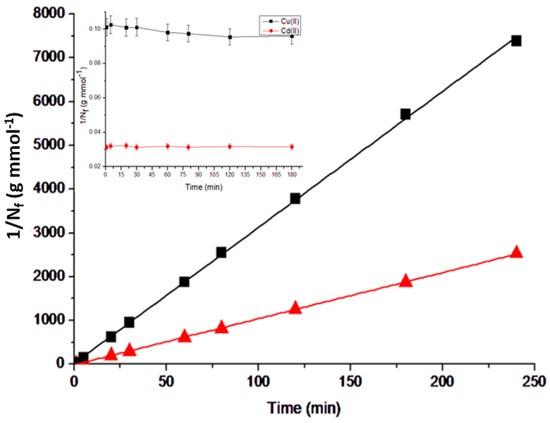 where Nft represents the adsorption capacity as a function of time (mmol g−1); Ne corresponds to the adsorption capacity at equilibrium (mmol g−1); K is the kinetic constant of the pseudo-second order (g mmol−1 min−1), and t is the contact time in each experiment (minutes). By plotting t/Nft versus t, linearized kinetic isotherms were generated for the studied metal species, as depicted in Figure 8. We can observe a great agreement between the experimental data and the pseudo-second-order kinetic model, as evidenced by the high coefficients of linear correlation obtained (r2 = 0.9999 for Cu(II) and r2 = 0.9996 for Cd(II)). Considering an equation of the form y = Bx + A, the linear equations obtained for Cu(II) and Cd(II) are y = 10.539x − 11.566 and y = 31.062x + 22.330, respectively, where y = t/Nft and x = t. According to Equation (2), B = 1/Ne and A = 1/(K Ne2), by substituting the respective angular and linear coefficients for both metals, it was possible to calculate Ne and K for each species, resulting in Ne = 0.0948 mmol g−1 and K = −9.6031 g mmol−1 min−1 for Cu(II), and Ne = 0.0321 mmol g−1 and K = 43.208 g mmol−1 min−1 for Cd(II). Another piece of evidence that confirms the good agreement with this model is the similarity between the experimental adsorption capacity values (observed when the kinetic isotherms reach the highest adsorption capacity) and the calculated values (obtained from the mathematical model).