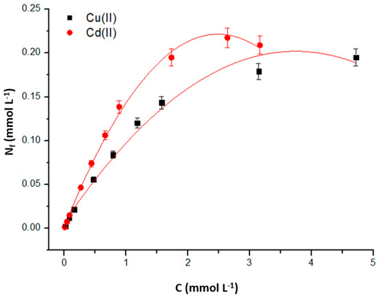 To determine the influence of the analyte concentration on the maximum adsorption capacity of the material, it was mechanically agitated with Cu(II) and Cd(II) solutions of different concentrations (1 to 400 mg L−1). For these experiments, the pH of the Cu(II) and Cd(II) solutions was adjusted to approximately 5.5, and the stirring time of the material with these solutions was 120 min. All batch experiments were performed at a room temperature of approximately 25 °C. After determining the residual concentration of the metals in the diluted supernatants, the adsorption capacity for all experiments was calculated using Equation (1):