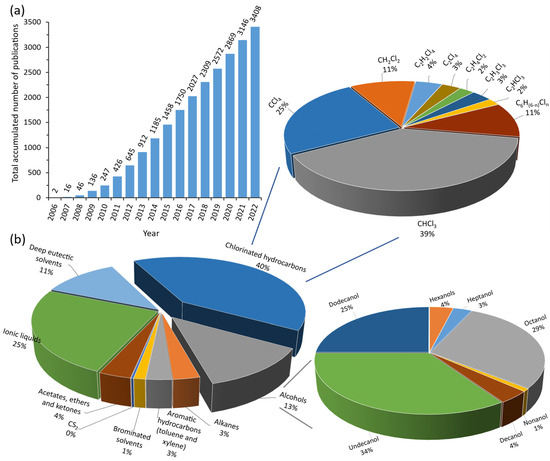 Bibliometric analysis of dispersive liquid–liquid microextraction (DLLME) publications: (a) year-wise publications between 2006 and 2022; (b) extraction solvents used for DLLME from aqueous samples and their distributions. Data were retrieved from the Scopus database. The detailed methodology of the bibliometric study is discussed in the Supplementary Material.
