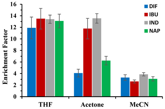 The potential use of OV-225 silicone as an extraction medium in DLLME was investigated via the extraction of four NSAIDs from aqueous samples (Figure S1) followed by HPLC/UV for separation and detection, according to the procedure described in the Section 2. The DLLME conditions were optimized to achieve the highest EF with each of the studied analytes. Notably, the rate and yield of extraction are greatly influenced by the efficiency of extractant dispersion through the sample solution. Hence, efficient extractant dispersion into an enormous number of fine droplets increases the sample/extractant interfacial area, and leads to more effective extraction. This effect could also be perceived from the well-known mathematical perspective of extraction: where is the analyte’s recovered fraction, is the extractant–sample volumetric ratio, is the distribution constant, and is the number of extraction steps. Here, in DLLME is related to the number of localized extraction processes that simultaneously take place within the sample, which is largely determined by the dispersion efficiency. Based on the importance of the dispersion step in DLLME, three dispersive solvents were tested: acetonitrile, acetone, and tetrahydrofuran. Results with acetonitrile roughly showed an enrichment of 3 with each of the studied analytes. Although better enrichment was obtained with acetone, the enrichment obtained with tetrahydrofuran was the highest with all analytes (Figure 2). Therefore, tetrahydrofuran was used as the disperser solvent in subsequent factor screening and optimization experiments.