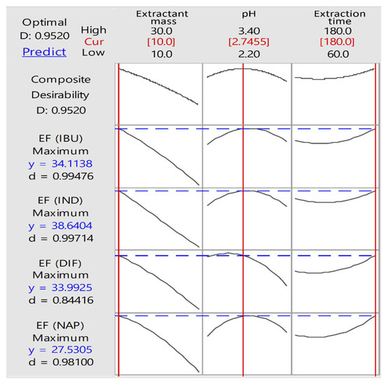 According to Mousavi et al. [13], the CCD is the most widely used optimization design in combination with any of the factor screening designs. Therefore, the CCD was used for the optimization of the three parameters found to be important by the factorial analysis. Notably, data from the FFD revealed higher EFs with longer extraction times and smaller amounts of the extractant polymer mass (Figure S4). It appears that decreasing the extractant mass (within the studied range of masses) resulted in a significant proportional decrease in the extract volume, with a small effect on the amount of analyte recovered, thereby forming a more concentrated extract and giving higher enrichment factors. Also, it was noticed that higher EFs were obtained with all analytes as the sample pH was lowered (Figure S5). This stems from the predictable lower ionization of the acidic NSAIDs at pH values below their pKa (see pKa values in Table 1). Accordingly, as the sample pH decreases, the proportion of the unionized species, which partition more readily to the polymer extractant phase, increases, leading to higher EFs. Based on these findings, the three effective factors mentioned above were included in the CCD so that the extractant polymer mass was fine-tuned over the range from 10 mg to 30 mg, the buffered sample pH was studied from 2.2 to 3.6, and the extraction time was optimized from 60 s to 180 s. All the experiments of the CCD as well as the corresponding responses (EFs) are presented in Table S2. The experimental data showed adequate fitting to a second-order polynomial function for each response, as demonstrated by p values of the lack-of-fit greater than 0.05 (Table S3). The adjusted coefficients of determination () were in the range of 0.72–0.84, indicating that an adequate percentage of data variability is explained by the developed mathematical model. Afterward, the desirability function was applied (using the response optimizer tool in Minitab) to predict the best combination of conditions to achieve the goal of maximizing the EF of each analyte. In calculating the global desirability, all responses were given the same importance. The highest value of global desirability (D = 0.95) was obtained under the following conditions: 10 mg extractant polymer mass, 2.7 added buffer pH, and 3 min of vortex mixing (Figure 3).