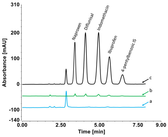 To evaluate the analytical performance of the developed method, two compounds were first tested to select an internal standard: 4-pentylbenzoic and 4-hexylbenzoic acids. These compounds have comparable structural and physicochemical properties to the studied analytes (Table 1) and, therefore, they should similarly respond to small extraction process and instrumental variations. Under the employed chromatographic conditions, both compounds came out after the last eluting analyte. The compound, 4-pentylbenzoic acid, was selected because it showed reasonable retention time, enabling faster analysis. All chromatographic peaks were symmetric and well resolved in an 8 min run time (Figure 4). The peak just after 2.50 min was attributed to the GC stationary phase extractant. Analyte signals were barely detectable before the extraction and became strong and evident after the DLLME. All standard curves (peak area ratio analyte/IS vs. analyte concentration in ng/mL) showed excellent linearity over the studied concentration ranges, with correlation coefficients above 0.999. The linearity ranges and concentration limits of quantitation are summarized in Table 2. The method has shown good precision and adequate trueness, as indicated by the RSD and error levels presented in Table 2. For instance, the analysis of NAP at 100 ng/mL showed a relative error of −0.52% and an RSD of 0.7%.