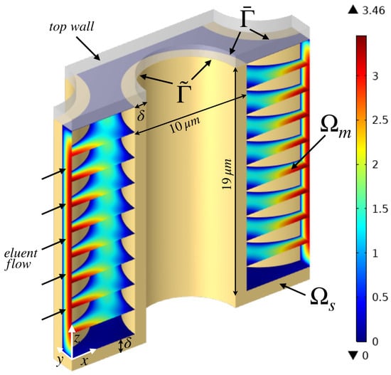 The anodization method adopted to obtain a porous layer of thickness on the lateral surface of the pillars cannot prevent the formation of a porous layer also on the bottom substrate as well. For this reason, Figure 1 shows the presence of the stationary phase of thickness (highlighted in yellow color) on both the sidewall of the pillars and the bottom wall. The top Pyrex wall is not affected by the anodization process because it is applied at the end of the process to seal the channel. The duration of the anodization process controls the thickness of the porous layer . Three different thicknesses are considered, namely . Before the coating procedure, the internal porosity is estimated as . It significantly reduces to after coating. The retentive capacity of coumarine C480 in the stationary phase can be modulated by changing the eluent (water–methanol) composition. Six different retention factors are considered, i.e., (no retention, before coating) and .
