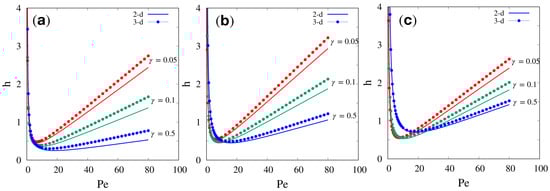 Comparison between 2-D and 3-D dimensionless plate height curves h vs. for the same porous-layer thickness and for three different values of : (a) ; (b) ; (c) .