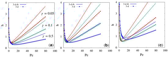 Comparison between 3-D and 3-D rb dimensionless plate height curves h vs. for the same porous-layer thickness and for three different values of : (a) ; (b) ; (c) .
