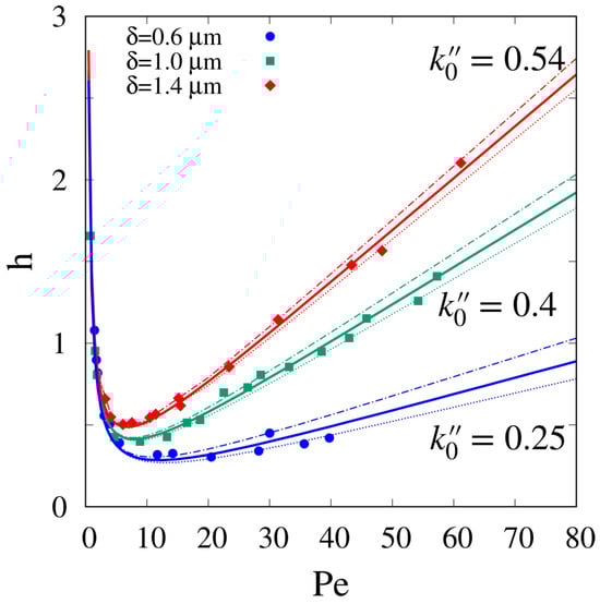 Comparison between model predictions and experimental data for h vs. for C480 in the non-retentive case. Different curves correspond to different values of the porous-shell thickness . Best-fit values of values of are shown in Figure 5. Continuous, dashed and dot-dashed lines indicates the predictions with , , , reported as points with error-bars in Figure 5.