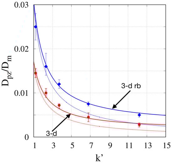 As expected, also in this retentive case, the 3-D model underestimates the porous-zone diffusivity with respect to the 3-D rb model. For both models, a similar decay of as a function of is observed, consistent with the general residence time-weighted expression for [43]