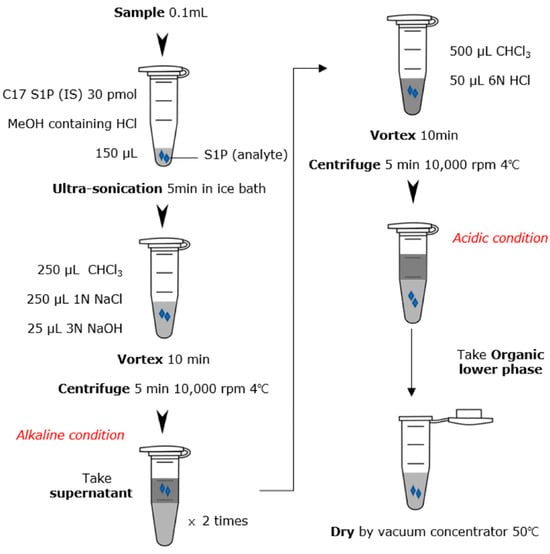Kidney samples were homogenized by ultra-sonication in RIPA lysis buffer (10 mM Tris-HCl, pH 8.0, 1 mM EDTA, 0.5 mM EGTA, 1% Triton X-100, 0.1% sodium deoxycholate, 0.1% SDS, 140 mM NaCl) containing protease inhibitors. After complete homogenization, the tubes were centrifuged at 14,000 rpm, 4 °C for 10 min. The supernatant was collected for protein assay and S1P extraction. Protein assay was performed according to the instructions of the Thermo protein assay kit (Pierce, IL, USA). Plasma samples were thawed at 37 °C. An aliquot of 100 μL of each sample was placed in an Eppendorf tube, and then 250 μL of methanol containing 0.6 μL of concentrated HCl and 30 pmol of C17-S1P as an internal standard was added. The tube was ultrasonicated in an ice-cold water bath for 5 min. After sonication, 250 μL CHCl3, 250 μL 1 M NaCl and 25 μL 3 N NaOH were added. The tube was vortexed vigorously for 10 min and centrifuged at 14,000 rpm for 5 min. The alkaline aqueous phase containing S1P was transferred to a new tube. The remaining lower layer was re-extracted with 125 μL methanol, 125 μL 1 M NaCl, and 13 μL 3 N NaOH. The combined aqueous fraction of the s1p extract was then mixed with 600 μL CHCl3 and 50 μL 6 N HCl. The tube was vortexed and centrifuged again. The CHCl3 phase was transferred to a new tube and dried with a vacuum concentrator. The entire extraction scheme is described in Figure 1.