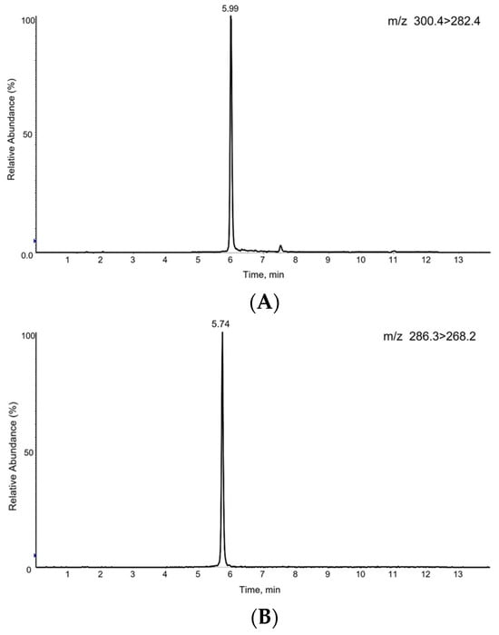For high ionization yield, 10 mM ammonium acetate and 0.1% formic acid were added. The addition of formic acid also has the advantage of peak separation. For high resolution, isopropanol was used in combination with acetonitrile. With optimized gradient conditions, the retention time of S1P in our chromatography system was 5.99 min (Figure 4A) and C17-S1P was 5.74 min (Figure 4B).