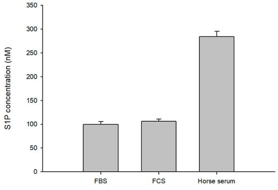 We analyzed serum S1P levels in three different sera. As shown in Figure 5, fetal bovine serum and fetal calf serum have similar concentrations. However, horse serum has a higher level of S1P. We thought this was due to the difference in erythrocyte levels between different species. The reference interval of bovine erythrocytes is 4.9–7.5 × 106/μL [18] and that of horse erythrocytes is 6.10–11.0 × 106/μL [19]. Since S1P is highly abundant in mature erythrocytes with high activity of Sphk1, higher levels of erythrocyte species seem to produce higher levels of S1P in serum [20,21].