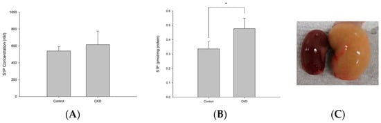 Measured S1P levels in plasma (A); and kidney tissue (B) (* p < 0.05) in CKD animals. (C) Morphological changes in the kidney: Control (left); CKD (right).