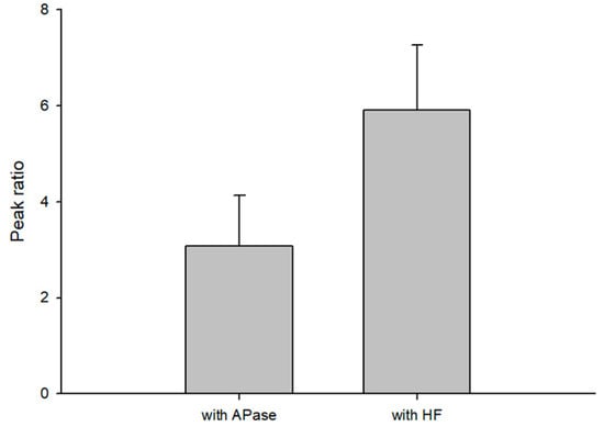 In this study, we compared the dephosphorylation reaction efficiency of HF and APase with an S1P standard solution and a C17 sphingosine standard solution as the internal standard (Figure 7). The dephosphorylation ability of HF exhibited clearly better efficiency than APase. HF is easier to obtain in the laboratory and the cost is much lower than APase.