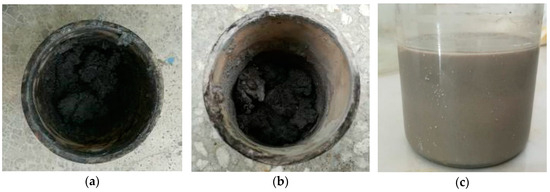 The curing test was carried out in a 500 mL beaker. Here, 100 g of concentrate was added to the beaker, and concentrated sulfuric acid was added afterward. That is when the curing timing started. A thermometer was directly placed in the sample for temperature measurement. It can be seen that a large number of bubbles were immediately produced, releasing a large amount of heat, and the material temperature rapidly increased, resulting in the material being in a black solid state (Figure 1a). Once the curing process ended, the material had poor adhesion to the beaker, making it easy to process further (Figure 1b). If heating is needed after mixing the materials, they will be placed in a muffle furnace (NBD-M1200-20TI, Henan Nobody Materials Science and Technology Co., Ltd., Zhengzhou, China). We started heating them to the set temperature at a specific rate, and then the timing was started.
