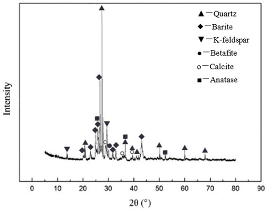 The ore received contained 0.04% betafite, 0.22% allanite, and a small amount of other U-, Nb-, and REM-bearing minerals. The concentrate was obtained through gravity separation and flotation. The main elemental compositions of the concentrate are provided in Table 1. The XRD pattern of the concentrate is shown in Figure 2. The main phases contained in the sample included quartz (SiO2), barite (BaSO4), K-Feldspar (KAlSi3O8), betafite ((Ca,U)2(Ti,Nb)2O6(OH, F)), and orthite ((Ce,Ca)2(Fe,Al)3[Si2O7][SiO4]O(OH)). The particle size of the concentrate was analyzed, and the particle size of approximately −75 μm accounted for 96.0% of the concentrate.
