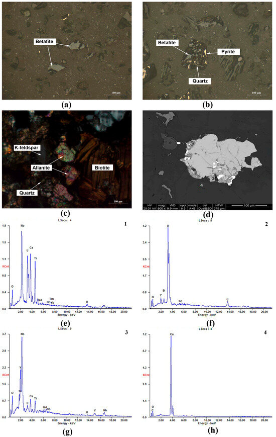 The phases of the main U- and Nb-bearing minerals (betafite, uraninite, fergusonite, feldspar, thorite, and ilmenorutile) and REM-bearing minerals (allanite, bastnaesite, gadolinite, and monazite) were also identified with optical microscopy (Figure 3a–c), SEM (Figure 3d), and EDS (Figure 3e–h). It should be noted that EDS can only provide qualitative and semi-quantitative results.