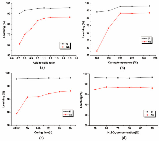 Effects of the: (a) acid-to-solid ratio, (b) curing temperature, (c) curing time, and (d) H2SO4 concentration on uranium and niobium recovery during the curing process.