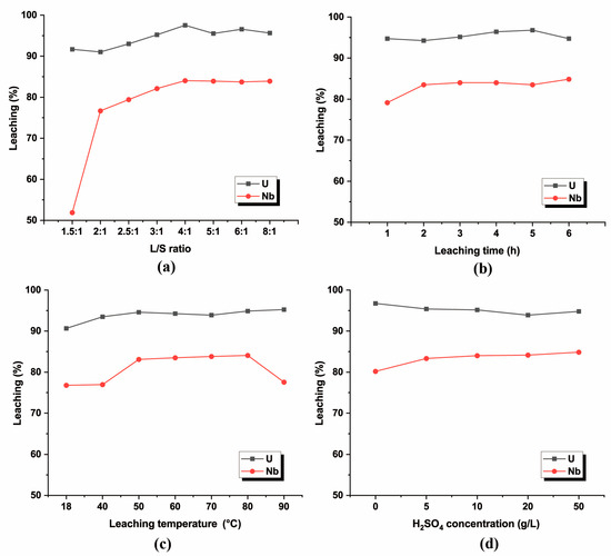 Effects of: (a) L/S ratio, (b) leaching time, (c) leaching temperature, and (d) H2SO4 concentration on uranium and niobium recovery during the leaching process.