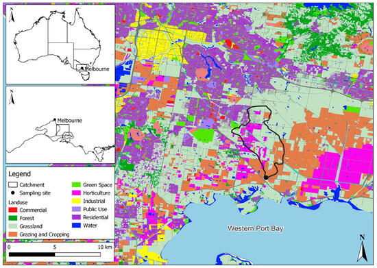 The location of surface water sampling site (n = 1) for method application within the Greater Melbourne area, Victoria, Australia. The land use layers showcased in this image were provided by Melbourne Water and the Victorian Department of Environment, Land, Water, and Planning (DELWP) through Spatial Economics [].
