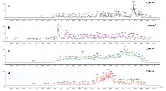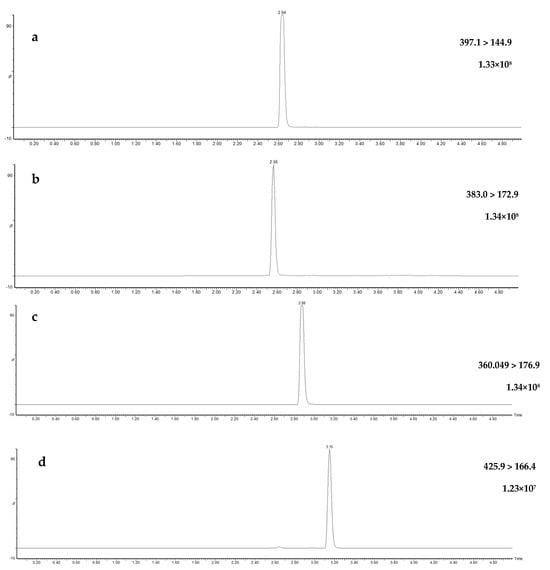 The utilization of formic acid and ammonium formate as additives in the mobile phase has been widely explored in various studies, with reported enhancements in peak intensity, separation of target compounds, and sensitivity of LC-ESI-MS detection [,,]. Consequently, a mobile phase composition of 0.1% formic acid (v/v) and 10 mM ammonium formate in Milli-Q water (mobile phase A) was chosen. During the initial optimization studies, it was observed that methanol as the second mobile phase yielded higher relative abundance and peak intensities compared to solvents such as pure acetonitrile. Similar findings were reported in a multi-residue analysis study of pesticides employing QuEChERS for water samples []. Therefore, pure methanol (mobile phase B) was selected as the final optimized configuration for mobile phase B.