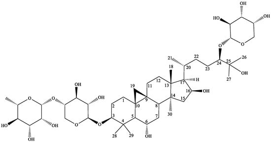 A number of studies indicate the promising cytotoxic activity of saponins from A. glycyphyllos. Fractions, rich in saponins, obtained from shoot cultures of the species, were tested on numerous malignant cell lines (T-24, CAL-29, MJ, and HUT-78), and the results were evaluated using a MTT test. The fractions exhibited high efficacy against urinary bladder cancer cells with a constitutive high expression level of the xenobiotic pump gp170 (MDR1) [1]. In a more recent study, the total saponin mixture, a purified saponin fraction, and a cycloartane saponin (17(R),20(R)-3β,6α,16β-trihydroxycycloartanyl-23-carboxylic acid 16-lactone 3-O-β-D-glucopyranoside) from the aerial parts of the plant were tested in different concentrations (12.5–200 µg/mL) against the same cell lines. The purified saponin fraction displayed the strongest cytotoxicity. In the same study, the saponin showed statistically significant immunomodulatory activity in vitro on a murine model of isolated mice lymphocytes and peritoneal macrophages (at concentrations of 1, 10, 20, 60, 100, and 200 µmol/L) [9]. The saponin 17(R),20(R)-3β,6α,16β-trihydroxycycloartanyl-23-carboxylic acid 16-lactone 3-O-β-D-glucopyranoside exhibited considerable neuroprotective activity in different models of cyanotoxin (anatoxin-α)-induced neurotoxicity on subcellular fractions (rat brain microsomes, mitochondria, and synaptosomes) at concentrations of 1, 10, and 100 μM [1]. The compound, together with the rare flavonoid camelliaside A, isolated from this species, displayed significant neuroprotective activity in vitro on a 6-hydroxydopamine-induced neurotoxicity model on isolated rat brain synaptosomes. Also, on human recombinant monoamine oxidase type B enzyme (hMAO-B), the saponin displayed strong inhibiting activity compared to selegiline [9]. Another novel cycloartane saponin (3-O-[α-L-rhamnopyranosyl-(1→2)-β-D-xylopyranosyl]-24-O-α-L-arabinopyranosyl-3β,6α,16β,24(R),25-pentahydroxy-20R-cycloartane), together with the rare saponin astrachrysoside A, both from A. glycyphyllos, were examined for their possible antioxidant and neuroprotective effects on different in vitro sub-cellular models. Both compounds exhibited statistically significant protective activity, while, on the activity of hMAO-B enzyme, they both showed a weak inhibitory effect [5]. In addition to these effects, a double fluorochrome staining study showed that a purified saponin mixture (PSM) from A. glycyphyllos significantly influenced the growth and proliferation of myeloid Graffi tumour cells in vitro. The PSM administered orally on Graffi-tumour-bearing hamsters significantly decreased transplantability and tumour growth, increased survival, and decreased mortality rates amongst animals. The observed pathomorphological changes in tumours were indicative of positive antitumor effect [9].