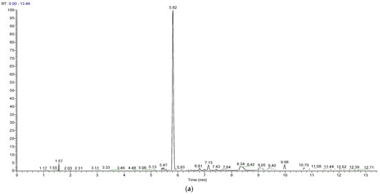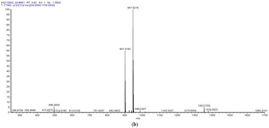 A novel UHPLC-MS method for the quantitation of AGOS3 was developed and validated, according to the approved ICH Q2 (R1) [20] guideline, in order to determine the amount of saponin in the micelles. Under the conditions used (see Section 2), AGOS3 had a retention time of 5.82 ± 0.01 min (Figure 2a). The MS spectrum confirmed that the deprotonated saponin [M − H]− (m/z 901.5162) forms a formate adduct during electrospray (−) ionisation [M + HCOO]− (m/z 947.5218) (Figure 2b). This flinging was in accordance to the literature [5]. Although rather expensive, MS detection is considered the “golden standard” when it comes to plant-derived secondary metabolites, especially those lacking a chromophore (as in the case of triterpenoid saponins, the chromophore is weak) [21].