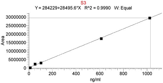 Two injections had a difference of ≤1.4%. Specificity was examined using a blank (MeOH). Peaks in with AUC >0.1% interfering at tR (AGOS3) were not found. No evidence of co-elution was found after peak purity analysis. A SIM mode was used to detect the compound (m/z 947.52), which makes the chance of the misidentification of the saponin statistically impossible [21]. Limits of detection and quantitation were calculated using the S/N from the response’s slope and standard deviation (SD). The limit of detection (LOD) is 0.001 ng/mL, and the limit of quantification (LOQ) is 0.01 ng/mL. These parameters allowed the quantitation of the biologically active compound in nanosized micelles, which are often a challenging object [23]. The linearity of the method was examined from 22% to 175% of the known concentration of the compound, using model solutions, prepared in MeOH. The calibration data were processed by linear regression. A correlation coefficient (r2) of 0.9990 was calculated after the linear least-square analysis (Table 2).
