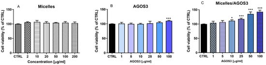 Effects of empty micelles, pure AGOS3, and AGOS3 loaded in micelles (micelles/AGOS3), on the proliferation of isolated mouse lymphocytes. The results are expressed as means ± SD of triplicate assays (n = 3). All groups were compared statistically vs. untreated controls by one-way Anova with Dunnet’s post-test. * p < 0.05, *** p < 0.001 vs. control.