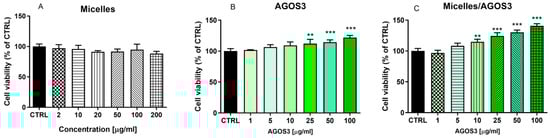 Effects of empty micelles, pure AGOS3, and AGOS3 loaded in micelles (micelles/AGOS3), on the proliferation of isolated mouse macrophages. The results are expressed as means ± SD of triplicate assays (n = 3). All groups were compared statistically vs. untreated controls by one-way Anova with Dunnet’s post-test; ** p < 0.01, *** p < 0.001 vs. control.