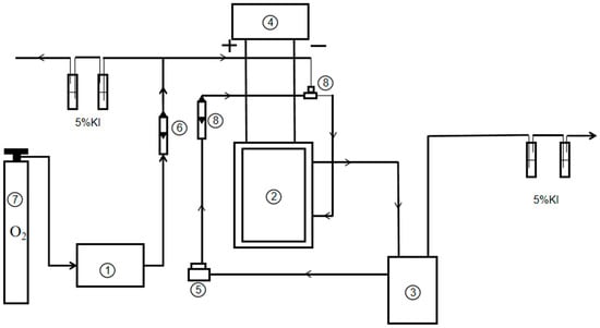 Experimental apparatus. 1. Ozone generator; 2. Anode and cathode electrode plates; 3. Water storage tank; 4. Stable voltage supply; 5. Pump; 6. Gas flow meter; 7. Oxygen cylinder; 8. Liquid flow meter.