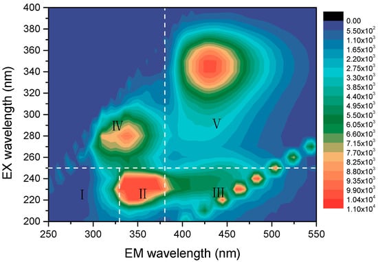 Fluorescence excitation–emission matrix (EEM) spectra can be used for multi-component analyses. The concentrated wastewater from the reverse osmosis processes of a Shaoxing City wastewater reuse system for printing and dyeing was chosen as the object of experimentation. The fluorescence EEM spectrum of the wastewater is shown in Figure 2. The five regions of the fluorescence EEM spectrum represent different organic substances. (I) It mainly represents aromatic proteins such as tyrosine and tryptophan. (II) It represents tryptophan-like substances and is the main fluorescent substance in coking wastewater. (III) It represents humic acid-like substances and is one of the dissolved organic matters. (IV) It represents fulvic acid-like substances and is also one of the dissolved organic matters. (V) It represents microbial metabolites such as amino acids and organic acids. As can be seen from Figure 2, the main types of organic matter in wastewater are tryptophan-like substances, humic acid-like substances, fulvic acid-like substances, and microbial metabolites [32,33].