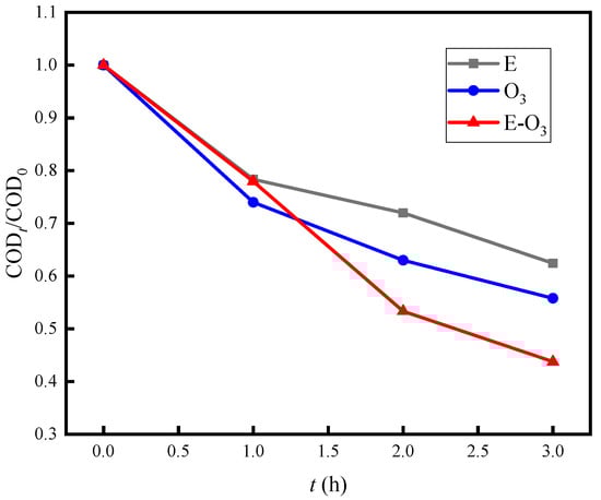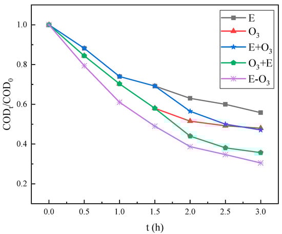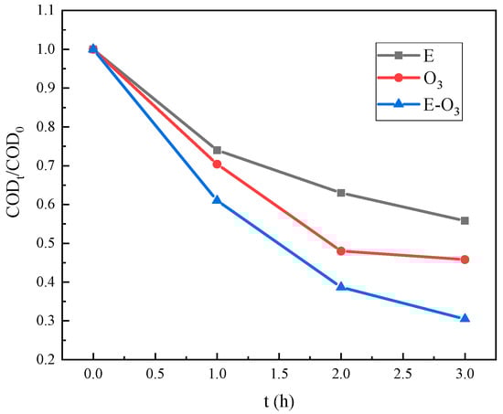 This phenomenon can be rationally explained. In the electrolysis system, the reaction interface is two-dimensional. Organic matter is predominantly adsorbed and oxidized by the anodic electrolysis under the influence of electrophoresis. For certain organic substances that are not readily adsorbed by the anode, the oxidation efficiency is low due to the inferior mass transfer efficiency. Numerous studies have demonstrated that after ozonation treatment, a substantial amount of organic acids are generated and the pH of wastewater exhibits a downward trend [46]. This is ascribed to the electrophilic reaction of ozone with unsaturated groups. In the E-O3 process, this characteristic of ozonation facilitates the initial conversion of some organic substances into substances that are easily adsorbed by the anode and subsequently undergo electrocatalytic oxidation.
