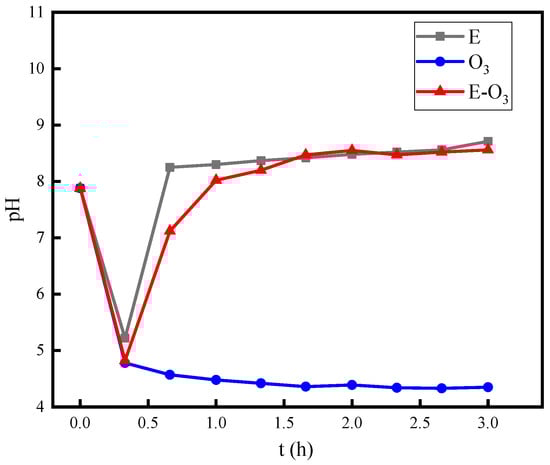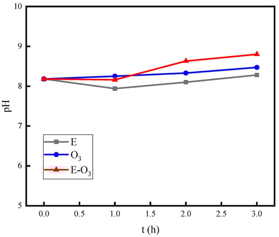 The pH value of the solution is a key factor affecting the efficiency of ozone-based AOPs, and the removal of carbonate has a significant impact on the change in pH during the reaction process, thereby affecting the efficiency of ozone decomposition to produce hydroxyl radicals. Moreover, carbonate itself has an impact on advanced oxidation reactions. By removing carbonate through the preliminary treatment process, the variations in pH in the wastewater treatment process by the three systems of ozonation, electrolysis, and E-O3 are depicted in Figure 9. As the reaction proceeded, the pH of the ozonation system gradually declined, and, ultimately, the pH of the system was maintained stably at approximately 4.3. Nevertheless, the pH of the electrolysis and E-O3 systems decreased initially and then increased, eventually stabilizing at around 8.2. This suggests that the combination of electrolysis and ozonation can prevent the accumulation of acidic intermediate products. It can be accounted for by the fact that the E-O3 system has a higher efficiency in generating hydroxyl radicals, which leads to the removal of the small organic acids produced by the direct oxidation processes of ozone.
