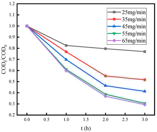 The dosage of ozonation is an important factor in the E-O3 process [34,42]. The influence of ozonation dosage on COD elimination in E-O3 wastewater treatment is presented in Figure 6. The COD elimination rates after three hours of reaction were 23.01%, 48.35%, 58.72%, 69.5%, and 70.7% with ozone inputs of 25 mg/min, 35 mg/min, 45 mg/min, 55 mg/min, and 65 mg/min, respectively, during the process. It can be observed that within a certain range, increasing the ozonation dosage can notably enhance the reaction efficiency of the E-O3 system. However, when it exceeds this range, further increasing the ozonation dosage has a limited impact on the efficiency improvement of the E-O3 system. This result is consistent with the outcomes reported in most studies. For instance, the report of Feng et al. indicates that when the ozone dosage is 0.25 mg/L, the removal efficiency of 2,4-DTBP is merely 5.9%. As the ozone dosage gradually increases, the removal efficiency of 2,4-DTBP gradually rises, but the rate of increase slows down later [43,44].