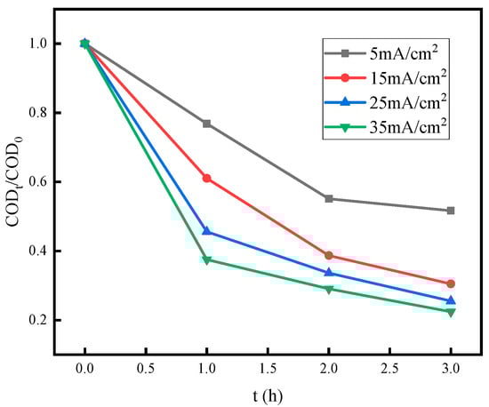 Current density is an important parameter for evaluating the efficiency of electron gain and loss per unit electrolysis area, and it is also a key parameter that affects the synergy efficiency of electrolysis and ozonation for the generation of hydroxyl radicals [45]. The impact of current density on the COD removal efficiency of E-O3 technology was studied, and the results are presented in Figure 7. At current densities of 5 mA/cm2, 15 mA/cm2, 25 mA/cm2, and 35 mA/cm2, the COD removal rates by the E-O3 technology were 48.4%, 74.8%, 79.3%, and 83.4%, respectively, after 3 h of reaction. It can be seen that as the current density increases, the efficiency of the E-O3 system rises, but the magnitude of the increase gradually decreases. The influence patterns of ozonation dosage and current density on the efficiency of the E-O3 system indicate that the efficiency of the E-O3 technology is mainly affected by the electrolysis efficiency and ozonation mass transfer efficiency. In engineering applications, under the condition of determined water quality and fixed pole plate spacing, the efficiency can be improved and the cost can be reduced by adjusting the appropriate ozonation dosage and current density.