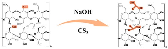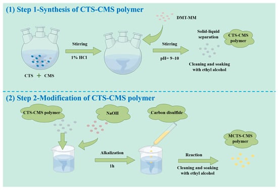 The chitosan–carboxymethyl starch (CTS-CMS) polymer was first prepared by blending and cross-linking and then alkalised with sodium hydroxide for 1 h. After several hours of reaction with a certain amount of CS2, the products were separated from the solution using absolute ethyl alcohol through solvent precipitation. Then, 70% ethanol was used for washing after filtration and soaking in absolute alcohol for 12 h. After vacuum drying, the preparation was completed, and the product was a brown–yellow powder. The preparation reaction of the MCTS-CMS polymer is demonstrated in Figure 2, and the details are listed in the Supplementary Materials. The MCTS-CMS polymer was formed through the xanthate acidification reaction between the CTS-CMS polymer and CS2 in an alkaline environment. Sulphur was introduced to the polymer after the modification to form new groups, such as the C=S group or the thiol group. The new polymer structure is shown in Figure 3.