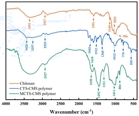 Figure 4 shows the FTIR spectra of the chitosan, CTS-CMS polymer, and MCTS-CMS polymer.