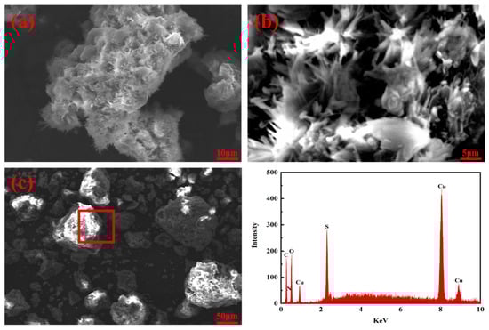 The surface morphologies of the MCTS-CMS polymer before and after copper ion adsorption were visualised using SEM. Figure 5 shows the SEM micrographs of the MCTS-CMS polymer at various magnifications. The CTS-CMS polymer has a rough and puffy surface, and the MCTS-CMS polymer surface has needle-shaped protuberances and roughness (Figure 5a,b). This finding suggests that the adsorption capacity of the modified polymer may increase; however, further verification through testing or experiments is required. This structure also provides additional adsorption sites on the surface of and inside the adsorbent [40]. The SEM micrograph of the MCTS-CMS polymer after the adsorption of copper ions distinctly differed from Figure 5c. The previous needle-shaped protuberances were completely covered by particles, and the polymer became spherical after the adsorption. According to the EDX spectrum of the MCTS-CMS polymer after the adsorption, carbon, oxygen, sulphur, and copper elements are present in the polymer. This result confirms the existence of copper ions adsorbed by MCTS-CMS and that the polymer has an adsorption effect on copper ions.