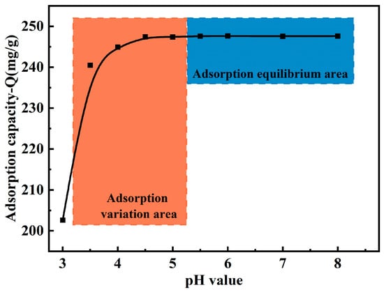 The relationship between the adsorption capacity of the MCTS-CMS polymer and the pH (3.0–8.0) is shown in Figure 6. Adsorption experiments were carried out under acidic conditions from pH 3.5 to 8.0. The adsorption time, reaction temperature, and initial concentration were 5 min, 323 K, and 120 mg/L, respectively. According to the results, the Cu(II) adsorption capacity of the MCTS-CMS remarkably increased with increasing pH from 3.0 to 4.0. When the pH increased from 4.0 to 8.0, virtually no change was observed in the polymer’s adsorption capacity. At low pH values, a large number of hydrated hydrogen ions are present in the solution, which may lead to a highly protonated adsorbent surface. This protonation could cause the electrostatic repulsion of the positively charged copper ions. However, as the pH increases, this protonation effect diminishes. This finding indicates that MCTS-CMS is suitable for treating copper-containing wastewater with a pH greater than 4.0.