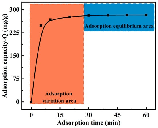 The effect of the contact time on the Cu(II) adsorption capacity of the MCTS-CMS polymer was studied, as shown in Figure 7. The solution pH, reaction temperature, and initial concentration were 5.0, 323 K, and 120 mg/L, respectively. The Cu(II) ion adsorption capacity of the MCTS-CMS polymer increased with increasing adsorption time. Particularly, a rapid increase in the adsorption capacity was observed during the first 5 min. After 30 min, the adsorption equilibrium was reached. The maximum value remained constant, even when the adsorption time was extended beyond 30 min. Therefore, an adsorption time of 30 min was identified as sufficient to reach the adsorption equilibrium.