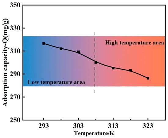 Figure 8 illustrates the effect of the reaction temperature (293–323 K) on the modified polymer’s Cu(II) adsorption capacity. The solution pH, adsorption time, and initial concentration were 5.0, 30 min, and 120 mg/L, respectively. The Cu(II) adsorption capacity of the MCTS-CMS polymer decreased from 316.65 mg/g to 286.39 mg/g as the temperature increased. These results showed that the adsorption process between Cu(II) and MCTS-CMS was exothermic. On the one hand, according to Le Chatelier’s principle, the system reduced the adsorption to balance the added energy when the temperature increased. On the other hand, as the temperature raised, the kinetic energy of both the adsorbate and adsorbent molecules increased, weakening their interactions and leading to an increase in the desorption rate of the adsorbate, thereby reducing the effective adsorption [41]. In summary, the adsorption capacity decreased as the temperature increased. The optimal temperature chosen was 293 K, at which the MCTS-CMS polymer exhibited a relatively high adsorption capacity and was easily implementable in industrial applications. Future research can further optimise the polymer structure to enhance its adaptability at higher temperatures, thereby expanding its practical application range.