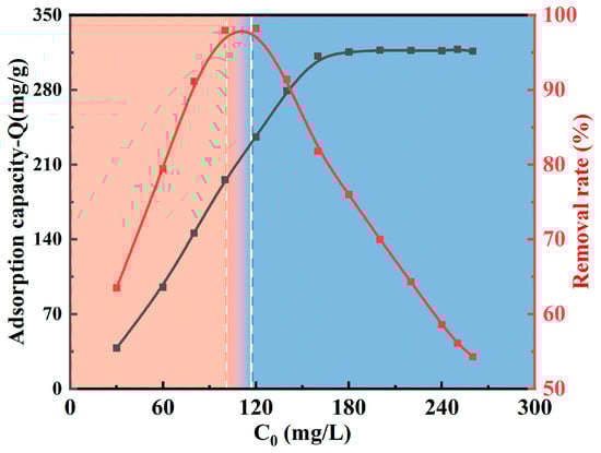 Adsorption tests are highly dependent on the initial concentration. Figure 9 shows how Cu(II) ions affect the MCTS-CMS polymer’s adsorption capacity and removal efficiency. The pH value of the solution, adsorption time, and reaction temperature were 5.0, 30 min, and 293 K, respectively. The adsorption capacity of the polymer increased with increasing initial concentration. When the initial concentration reached 160 mg/L, the adsorption capacity gradually flattened, and the maximum Qe was approximately 317.29 mg/g. Meanwhile, the removal efficiency of Cu(II) ions exhibited an initial increase followed by a subsequent decrease. The maximum removal efficiency reached approximately 98% when the initial concentration ranged from 100 mg/L to 120 mg/L. As the initial concentration continued to increase, the removal efficiency decreased rapidly, which may be because of the adsorbent reaching its maximum adsorption capacity.