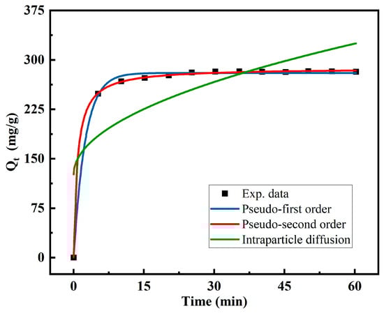 Different kinetic models were investigated to study the kinetics of the Cu(II) removal. The fitting results are shown in Figure 10, and the kinetic constant (K) and linear correlation coefficient (R2) are presented in Table 1. R2 is often used to measure the predictive effect, and its numerical range is from 0 to 1: the higher its value, the better the prediction. According to the comparison among the three different models, the pseudo-second-order model fitted the data better than the others. As shown in Table 1, the pseudo-second-order model had the maximal correlation coefficients under the same test conditions, and its calculated and experimental Qe values were in agreement. This finding confirms that the pseudo-second-order kinetic model is appropriate for describing the Cu(II) adsorption by the MCTS-CMS polymer. Furthermore, the best fit confirms the dependency of the adsorption mechanism on the amounts of the adsorbate and adsorbent [42]. The interaction rate is proportional to the quadratic power of the reactant concentration. Hence, the chemisorption is explained by the high R2 value and the similar prediction of Qe.